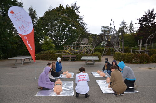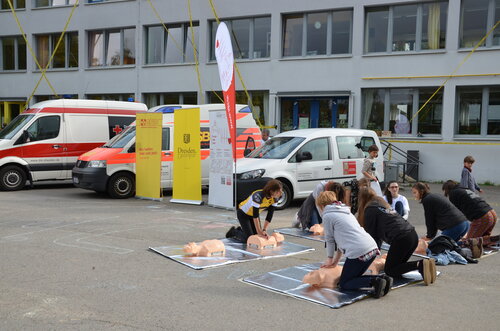 Unsere SchülerInnen erhielten professionelle Einweisung für die Durchführung von wiederbelebenden Maßnahmen. Auf unserem Schulhof trafen mehrere Rettungswagen ein, - nicht, weil wir Hilfe benötigten, sondern weil unsere Schülerinnen und Schüler wissen sollen, wie man Hilfe bei einem Herzstillstand leistet.